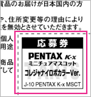 『PENTAX K-x ミニチュアマスコット』のミニパンフレットにある応募券3枚を一口として、官製はがきに貼り、郵便番号、住所、氏名、年齢、電話番号、お買い上げ店舗名を記入してご応募ください。