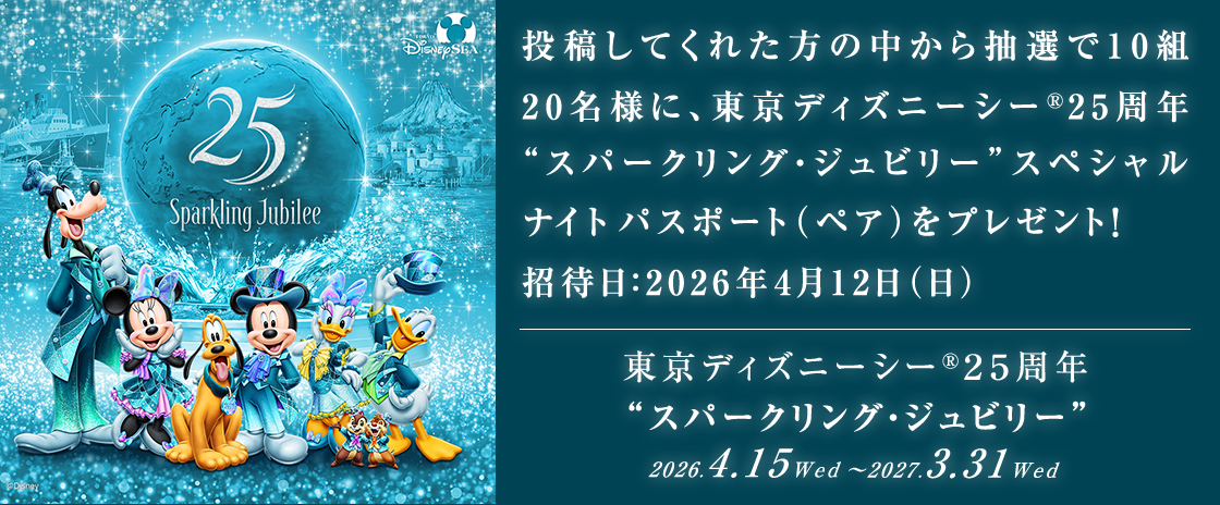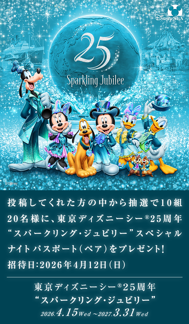 - 東京ディズニーシー®25周年“スパークリング・ジュビリー”スペシャルナイトパスポート(以下、本パスポート)は、東京ディズニーシー®に指定日時(2026年4月12日(日)19:30-22:30)の間に使用いただけるパスポートです。なお、本パスポートは当キャンペーン当選者以外の方も利用されます。