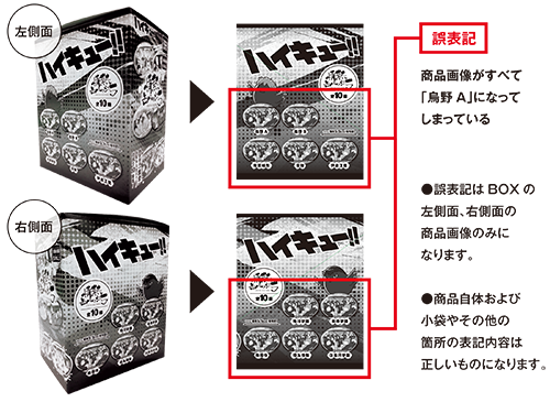 このたび株式会社タカラトミーアーツより販売する「ハイキュー!! 情熱缶バッジ5」について、BOXパッケージ内の商品画像一部に誤表記がございました。