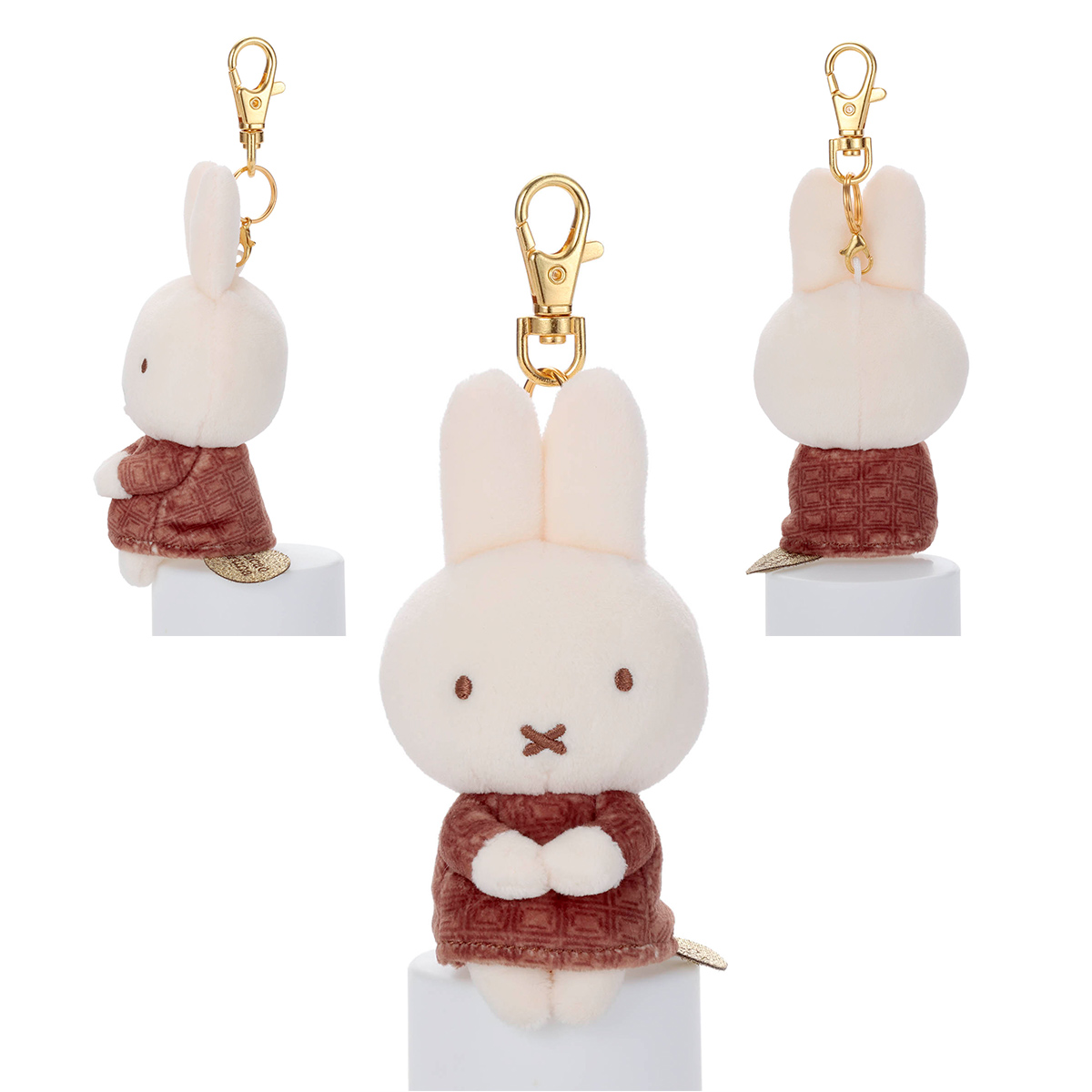 チョコレートをイメージしたCacao Brunaシリーズ。こちらはミルクチョコ柄の洋服を着た「ミッフィー」のキーチャームマスコット。「ちょっこりさん」シリーズはお行儀のよいお座りポーズで、いろいろなところに座らせたり、引っ掛けられるぬいぐるみです。サイズはW5.5×H11.5×D5.5cm。