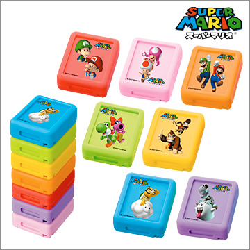 どんどん増えるDSソフト。本体と一緒に持ち歩くときは『スーパーマリオ DSカードシェル』が役に立ちます。1本ずつをしっかりガード。しかもジョイント式なのでかさばるソフトをひとまとめにできます。「レッドタイプ」「ピンクタイプ」「オレンジタイプ」「イエロータイプ」「グリーンタイプ」「ブルータイプ」「パープルタイプ」の全7種。