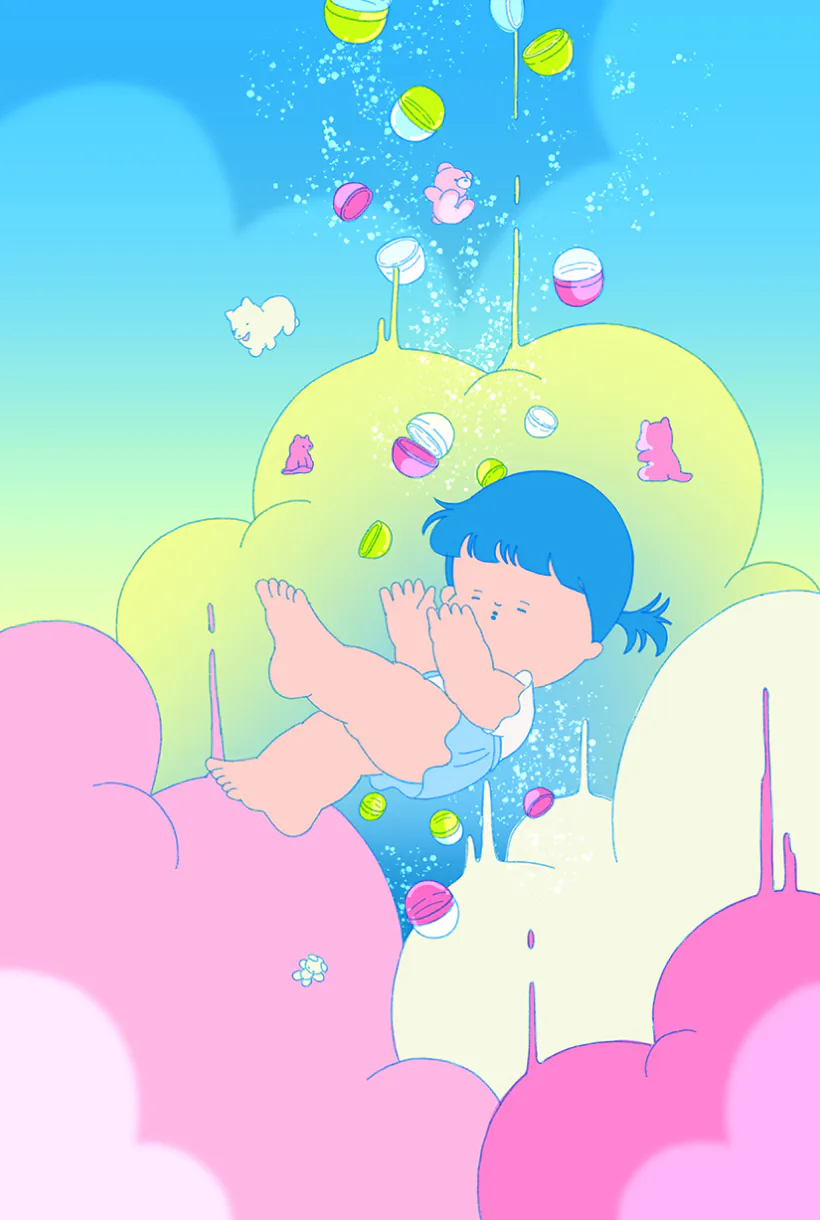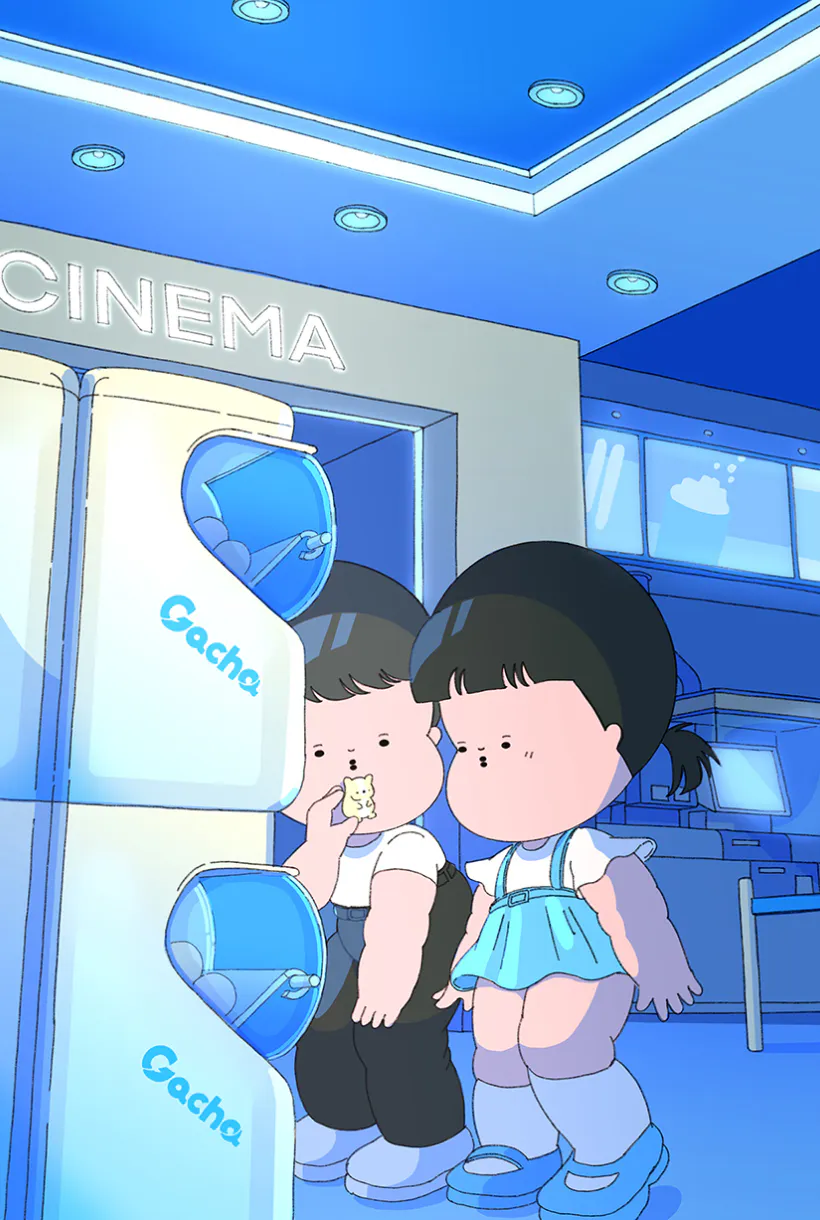 ガチャマシンがたくさん並ぶ一画に友達をひっぱっていき、かわいい動物フィギュアのガチャ®を見つけて「これにしよう」と心に決める。ハンドルを手に取り、まわす手ごたえを感じた瞬間、視界がぐるっと回転して、目の前にパステルカラーの世界が広がっていく。