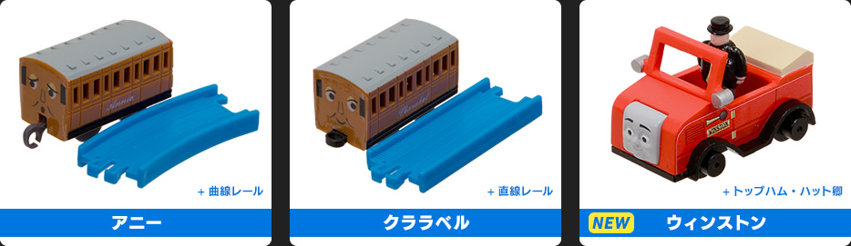 「昔のビクター(ゼンマイ)」「アニー+曲線レール」「クララベル+直線レール」「ウィンストン+トップハム・ハット卿」「顔付き貨車+曲線レール」