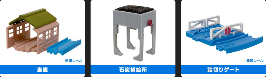 「タンク車(クリアーラメ)+曲線レール」「跳ね橋」「車庫+直線レール」「石炭補給所」「踏切りゲート+曲線レール」の全17種。