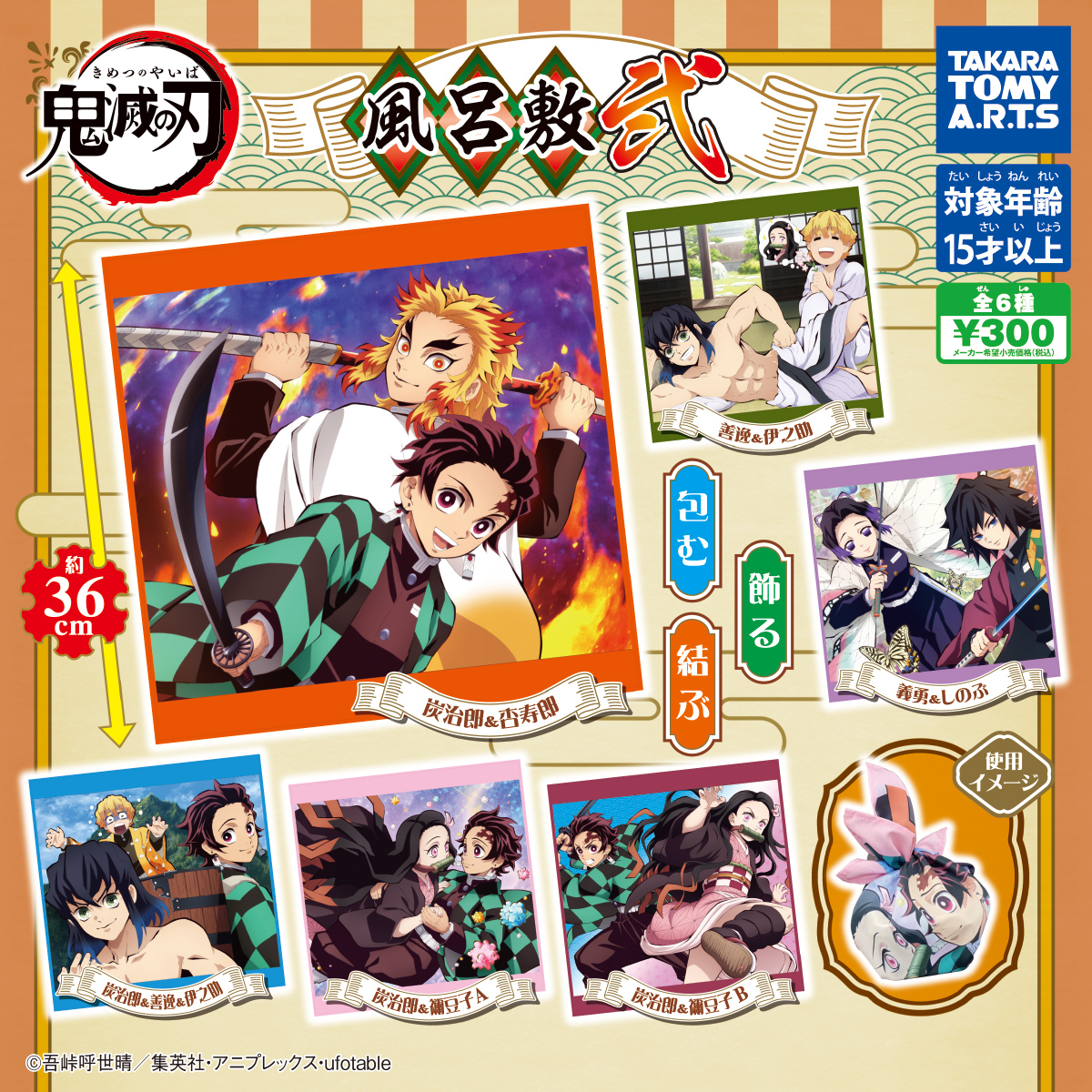 雑誌の表紙や中面を飾った、『鬼滅の刃』の華麗なイラストを使用した風呂敷の第2弾。包んだり、結んだり、飾ったりと、汎用性の高いアイテムです。サイズは36×36cm。