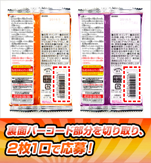 対象商品についているバーコードを2枚1口として、専用応募はがきまたは郵便はがきにしっかりと貼り必要事項をご記入のうえ、ご郵送ください。