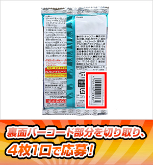対象商品についているバーコードを4枚1口として、専用応募はがきまたは郵便はがきにしっかりと貼り必要事項をご記入のうえ、ご郵送ください。