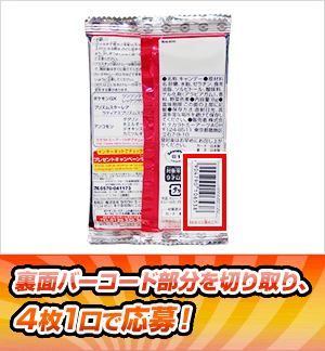対象商品についているバーコードを4枚1口として、専用応募はがきまたは郵便はがきにしっかりと貼り必要事項をご記入のうえ、ご郵送ください。