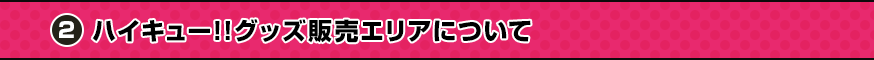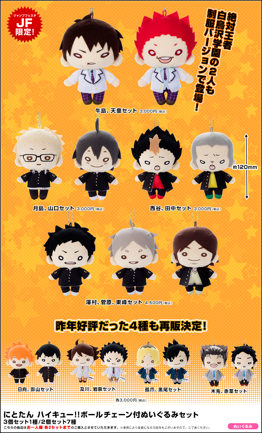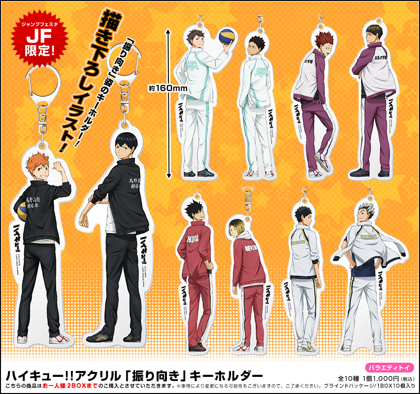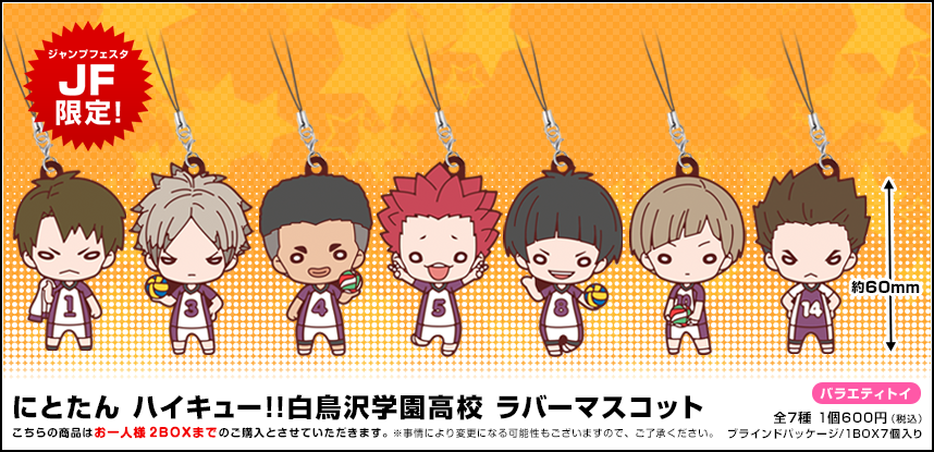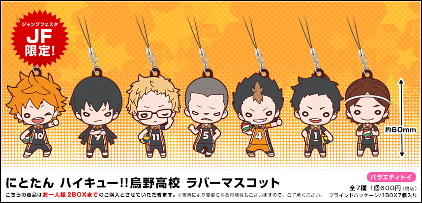 会場にて用紙をお渡ししますが、事前にダウンロードしてご使用いだたくことも可能です。オーダーシートをダウンロード - 限定商品の『ハイキュー!! アクリル「振り向き」キーホルダー』・『にとたん ハイキュー!! 烏野高校 ラバーマスコット』・『にとたん ハイキュー!! 白鳥沢学園高校 ラバーマスコット』はお一人様2ボックス、『にとたん ハイキュー!! ボールチェーン付ぬいぐるみセット』はお一人様各2セットまでのご購入とさせていただきます。
