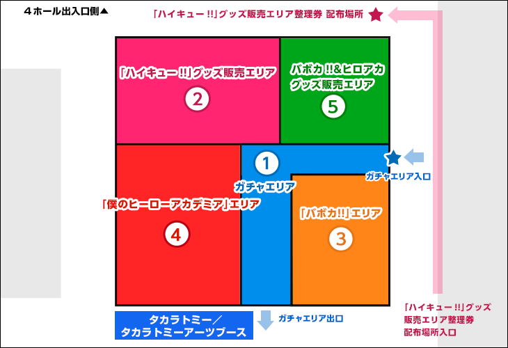 ①ガチャエリア②「ハイキュー!!」グッズ販売エリア③「バボカ!!」エリア④「僕のヒーローアカデミア」エリア⑤バボカ!!&ヒロアカグッズ販売エリア