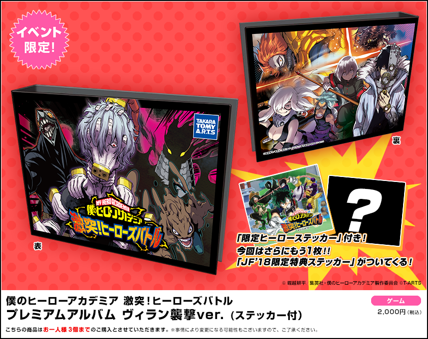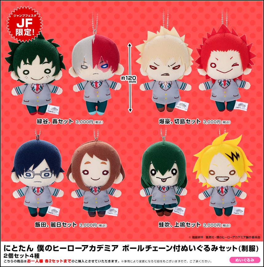 『にとたん 僕のヒーローアカデミア ボールチェーン付ぬいぐるみセット(制服)』はお一人様2セットまで、『僕のヒーローアカデミア 激突!ヒーローズバトルW プレミアムアルバム ヴィラン襲撃Ver.』はお一人様3個までのご購入とさせていただきます。 - 商品は全て税込、ジャンプフェスタ特別価格となっております。