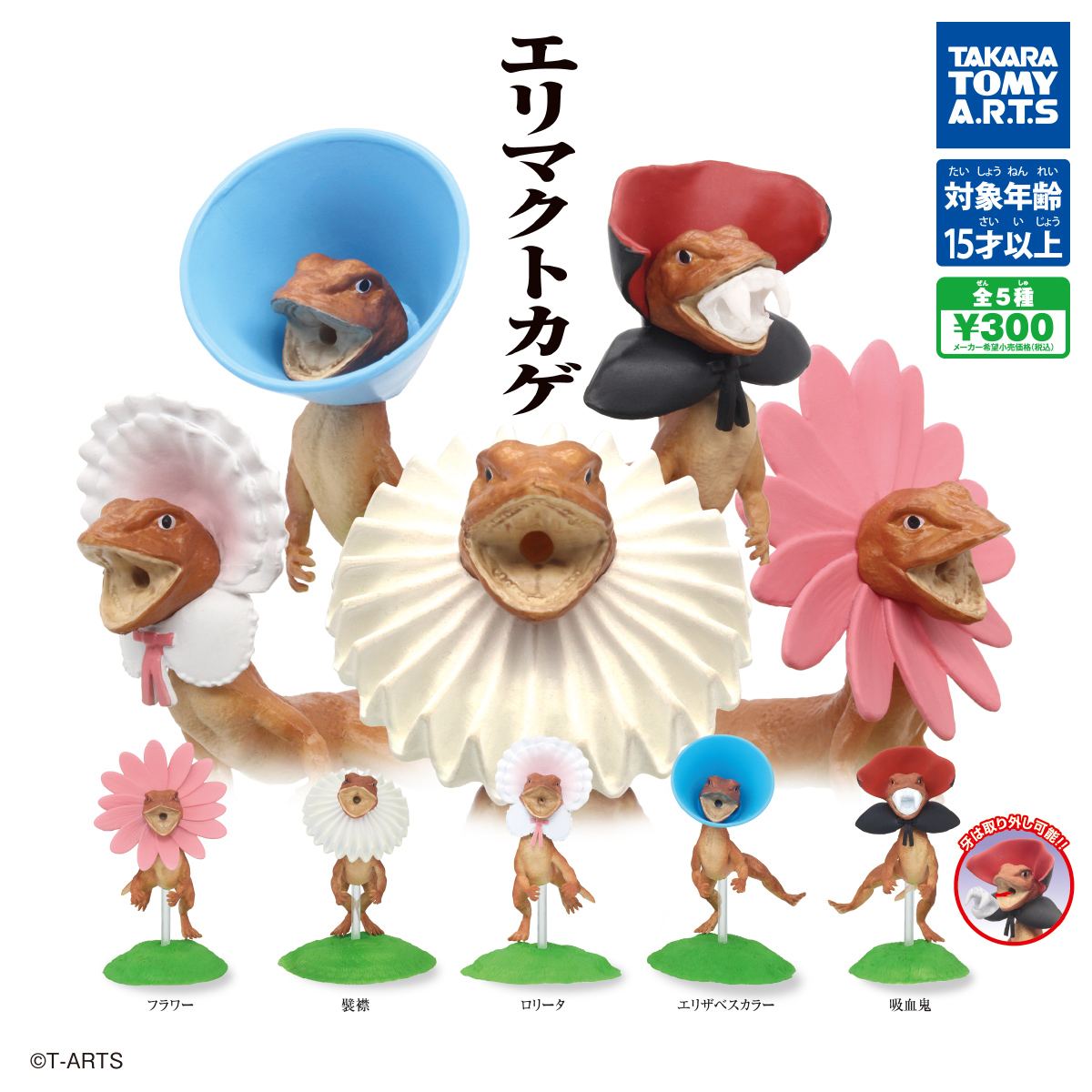 かつて一世を風靡したエリマキトカゲが、エリにいろんなものを巻く「エリマクトカゲ」となってガチャに登場。「吸血鬼」の牙は取り外しが可能で、ほかのトカゲにつけることもできます。本体サイズは約6cm。