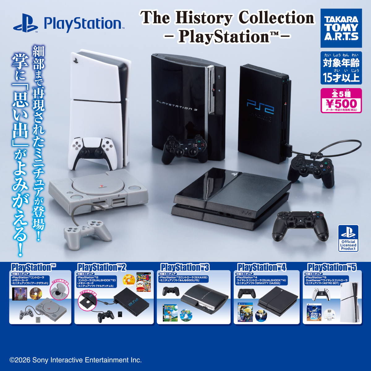 細部まで再現した「PlayStation™」のミニチュアモデルです。初代から最新までの本体がセレクトされており、それぞれ同スケールのコントローラーやゲームディスク、パッケージを再現できるパーツが付属。「PlayStation™」と「PlayStation™2」にはメモリーカードも付属します。初代はフタが開閉。本体サイズは約5.0cm(最大)。