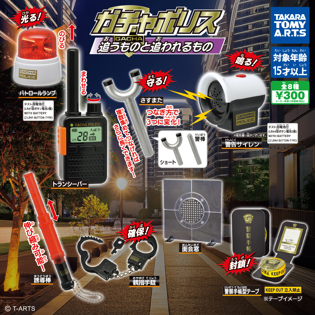 捜査アイテムをテーマにした、人気の「ガチャポリス」シリーズ。今作では「さすまた」や「トランシーバー」「面会窓」が新アイテムで仲間入り! 「パトロールランプ」はランプが光り、「警告サイレン」はサイレン音が鳴ります。本体サイズは約4.5〜12cm。
