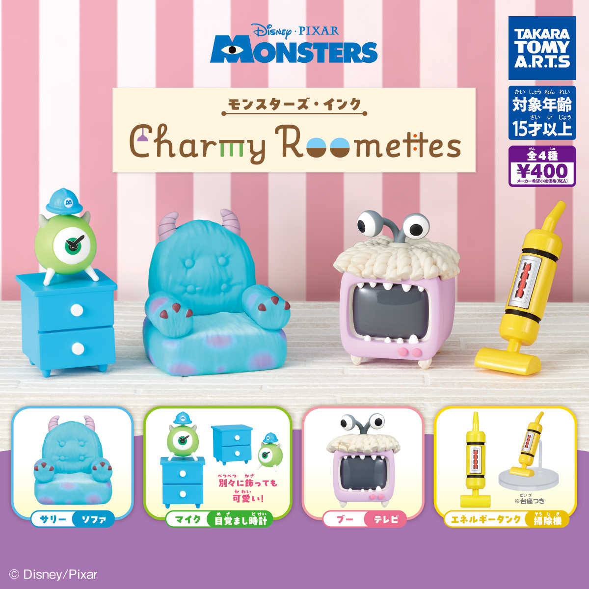 『モンスターズ・インク』の仲間たちをモチーフにした、タカラトミーアーツの描き下ろしデザインのインテリアグッズです。目覚まし時計は取り外しが可能で、掃除機には台座が付属します。本体サイズは高さ約4〜5.7cm。