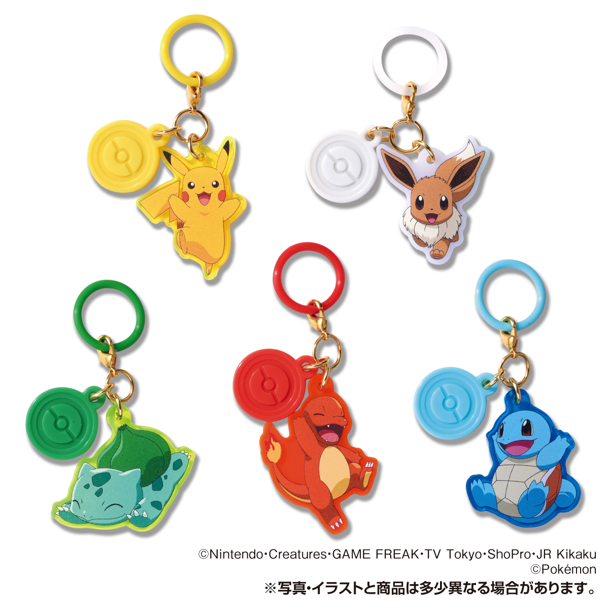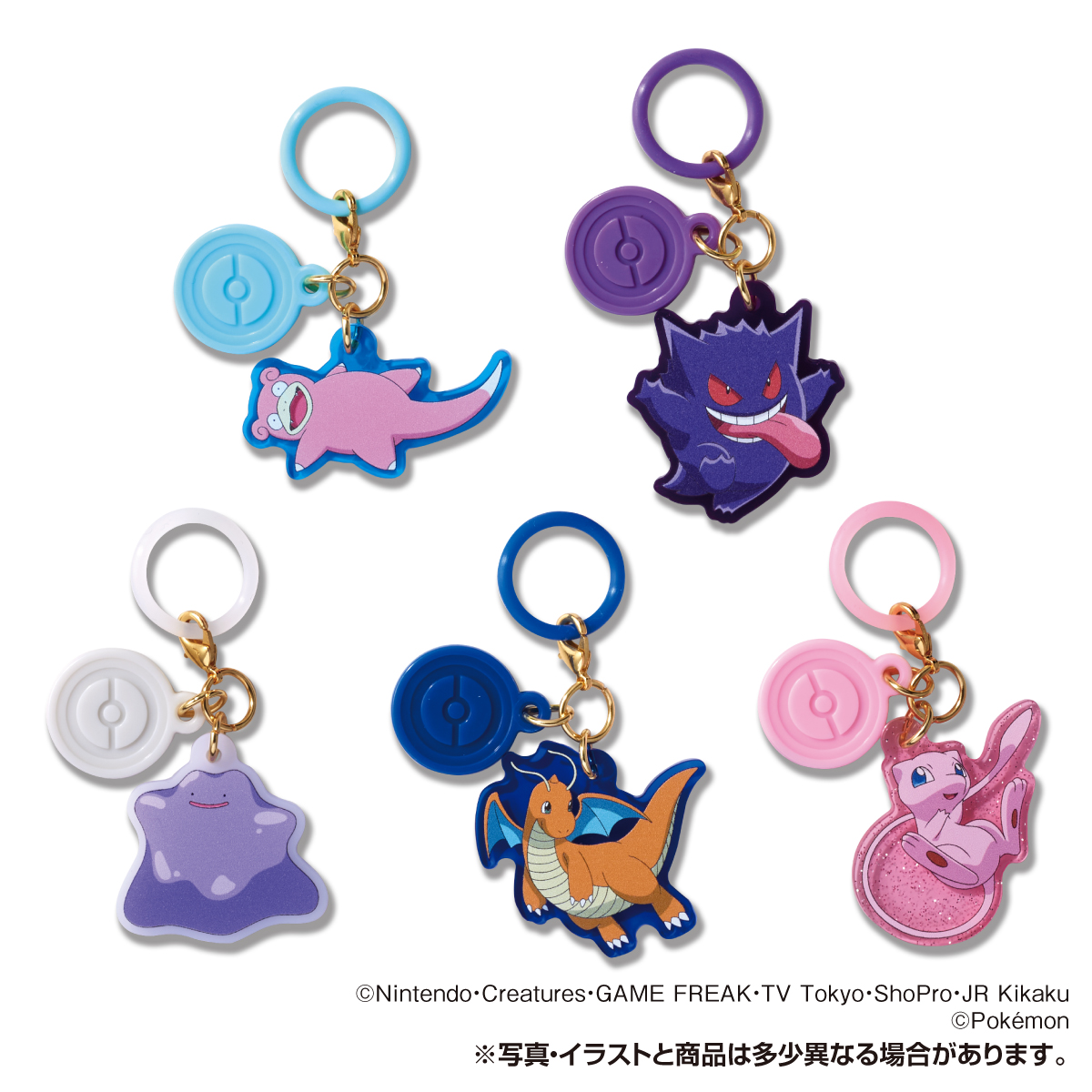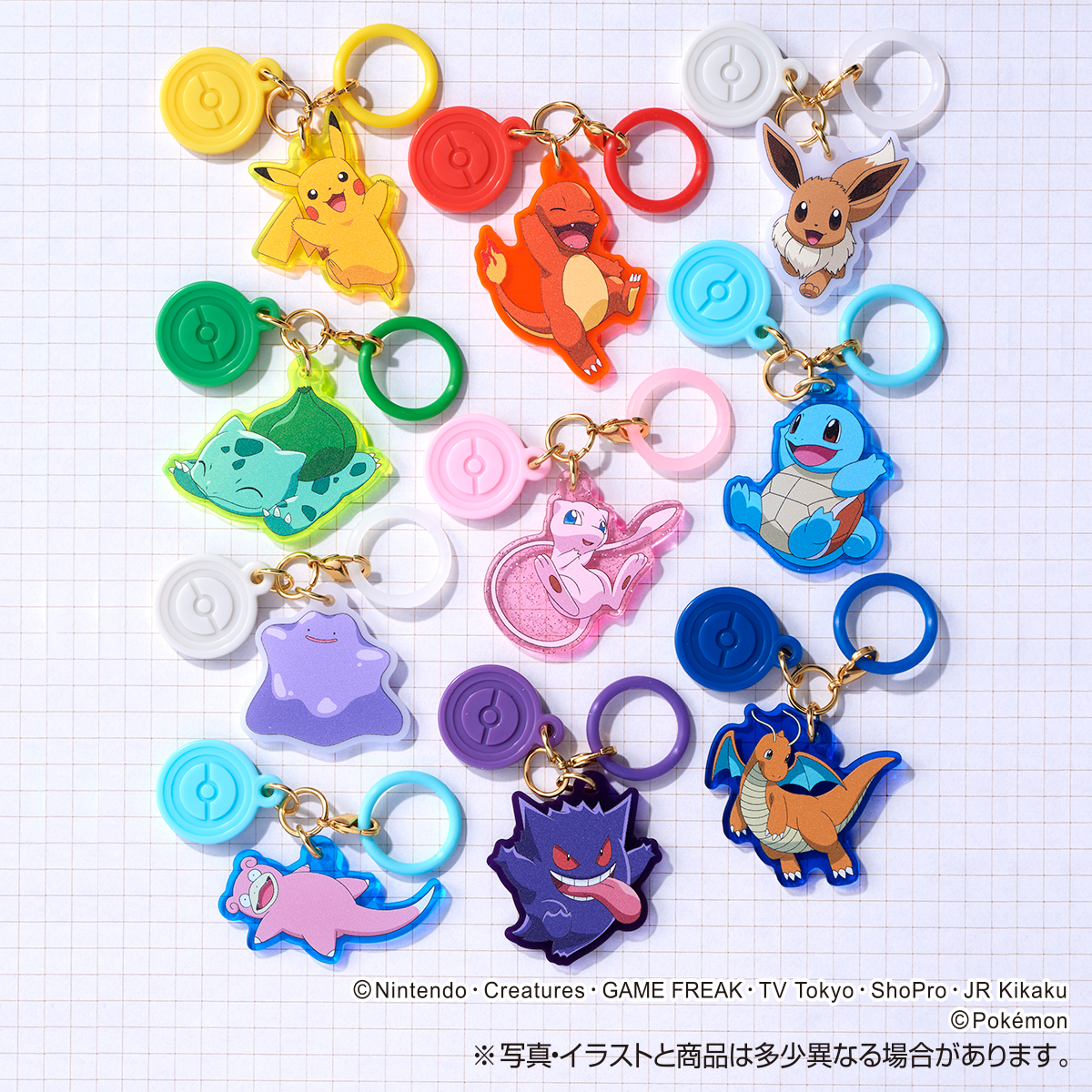 イベントやテーマパークに、身に着けてお出かけできるポケモンのリング付きアクリルチャ―ム。シリコンリングとチャームは、それぞれのポケモンのタイプをイメージしたカラーになっています。ミュウは特別なラメ入りのクリアなアクリル!ボール形赤白キャンディが5個入っています。