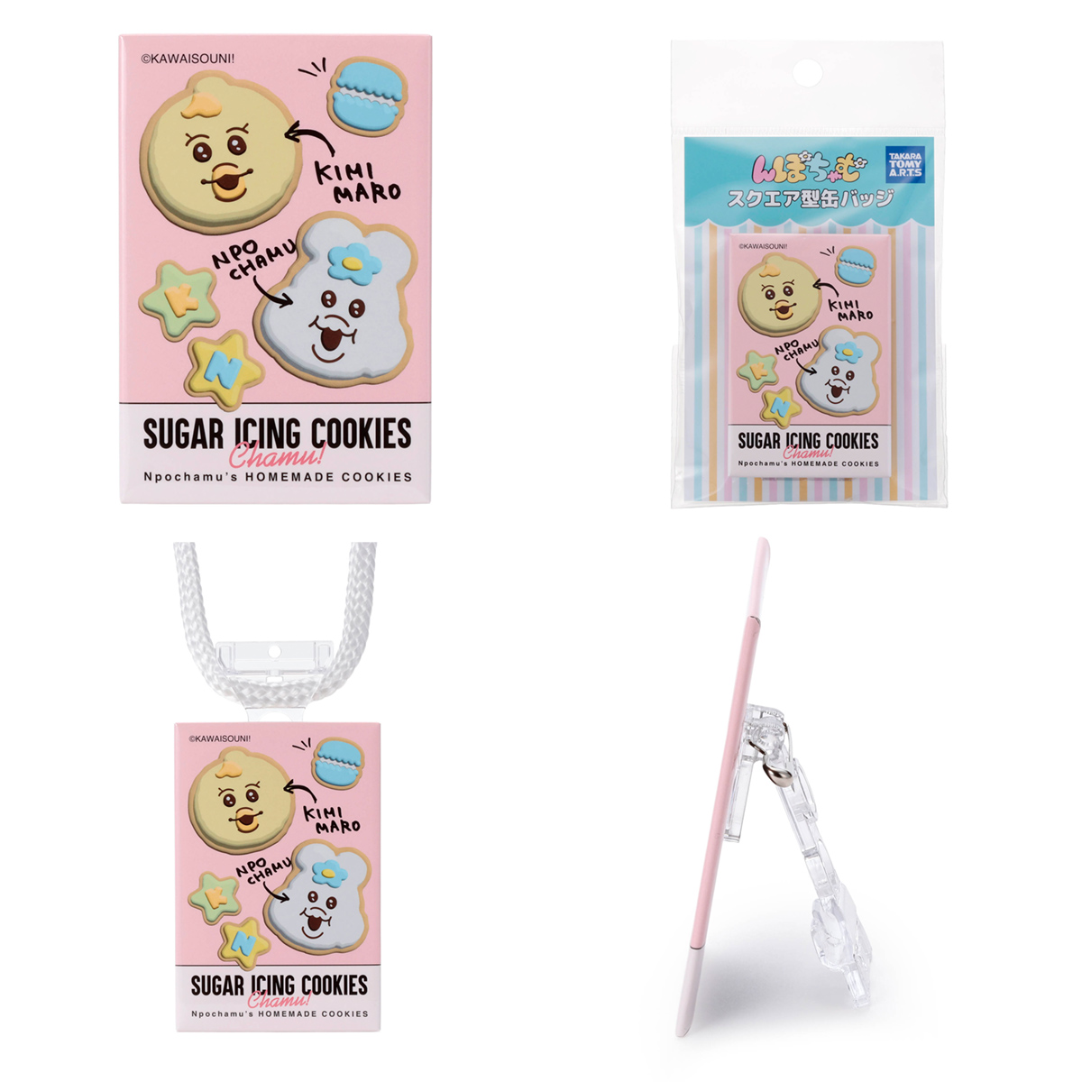 人気イラストレーター「可哀想に!」が描く、「んぽちゃむ」のスクエア形の缶バッジです。裏面にはスタンドが付いているので、缶バッジとしてだけではなく、立てることやひっかけることも可能です。こちらは「んぽちゃむ」と「きみまろ」のアイシングクッキー風のデザイン。サイズはW5.3×H8cm。
