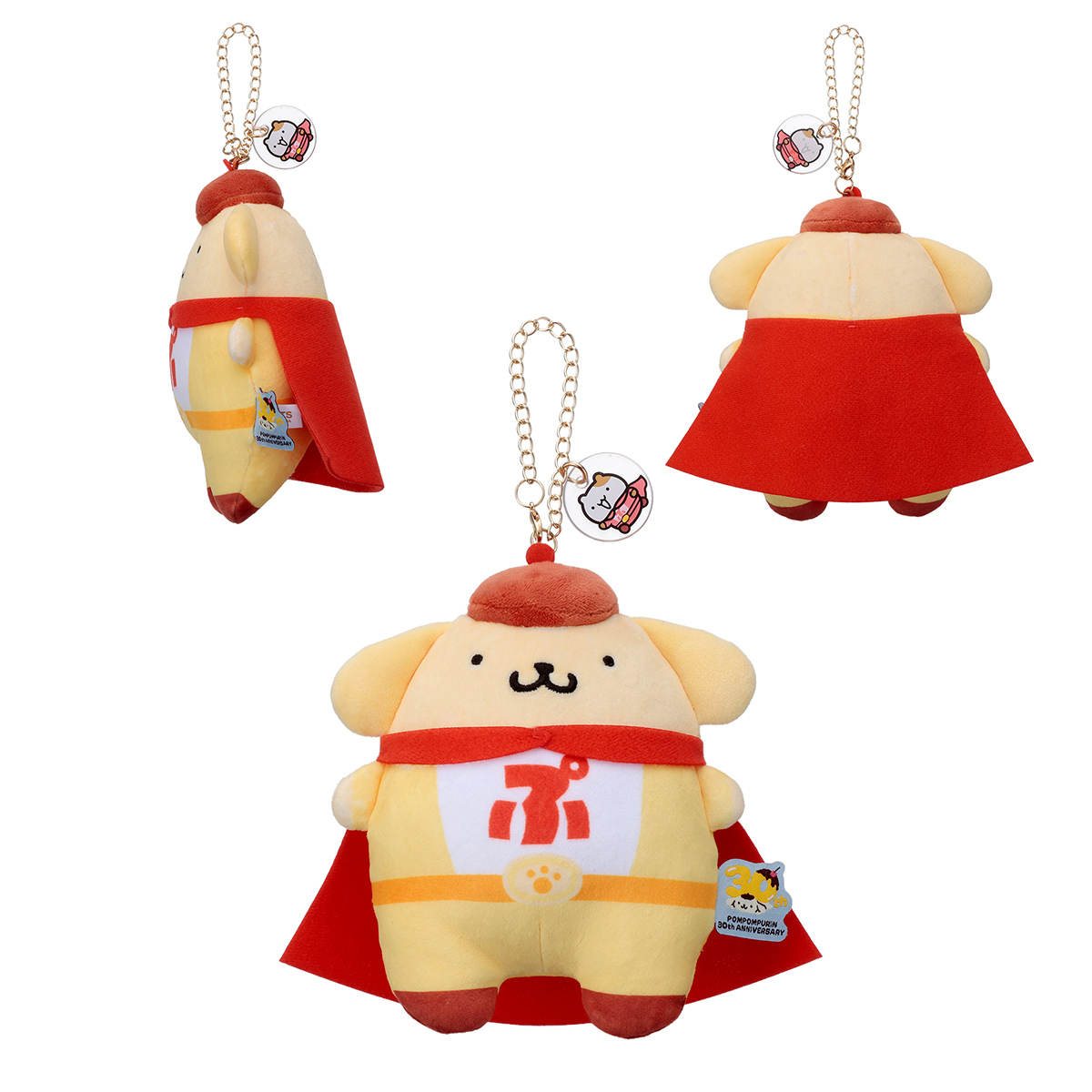 「ポムポムプリン」のデビュー30周年を記念した、ヒーローデザインのチェーンストラップマスコットです。「Mocchi-Mocchi-」シリーズは通常よりも細かな綿と伸縮性に優れた生地を使用しており、最高に触り心地の良いぬいぐるみです。手のひらサイズ&チェーンストラップ付きで、カバンなどに気軽につけられます。サイズはW17.5cm×H15.5cm×D7cm。