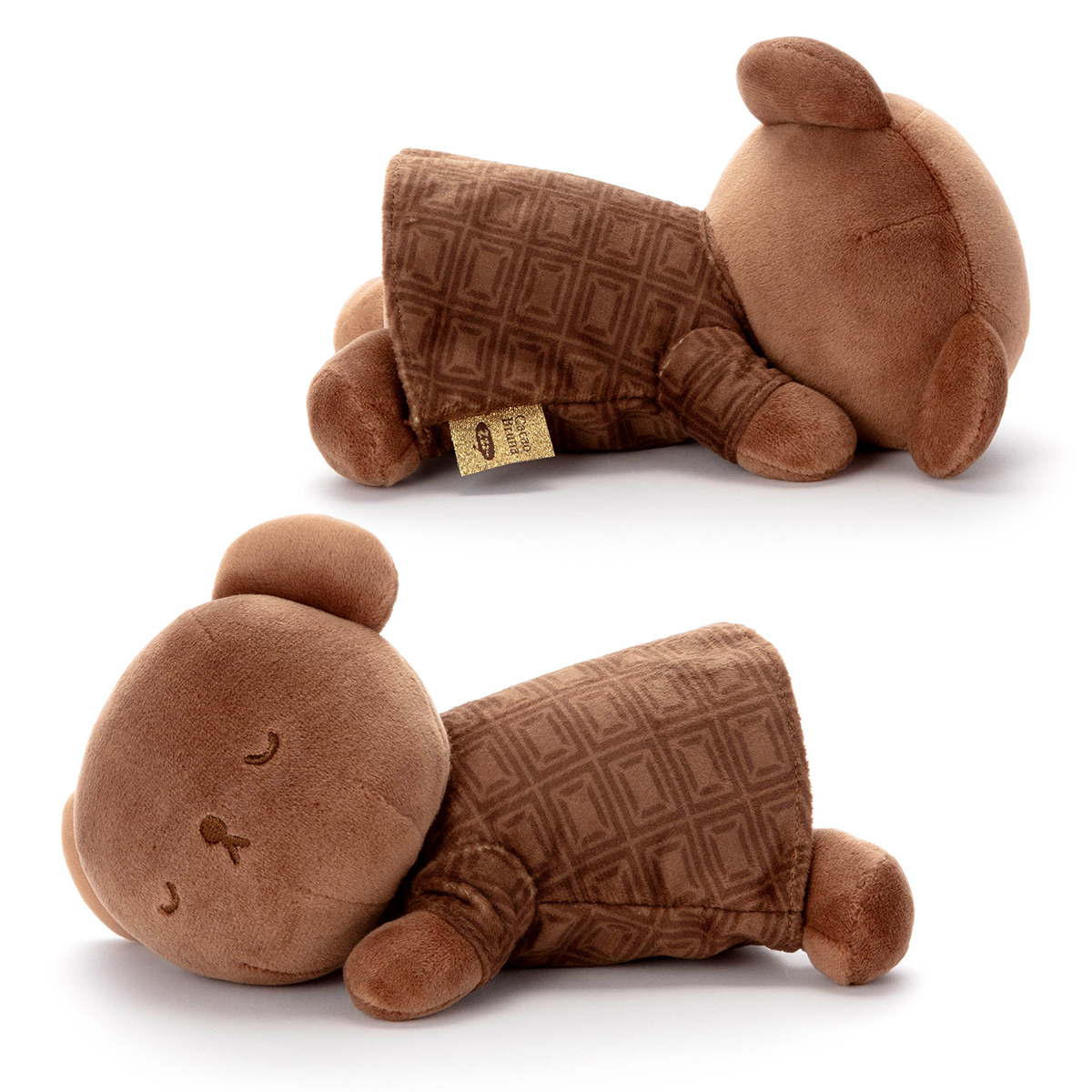 チョコレートをイメージしたテキスタイルのCacao Brunaシリーズ。お洋服がチョコレートイメージなだけでなく、付属のラベルもチョコレートの包み紙をイメージしています。すやすや眠っている姿がたまらなくかわいい「すやすやフレンド」シリーズのぬいぐるみです。