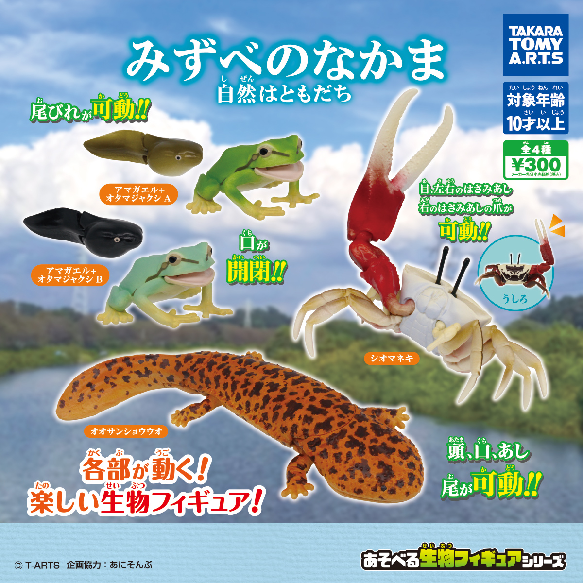 「あそべる生物フィギュアシリーズ」に、水辺の生き物たちが登場。「アマガエル」は口、「オタマジャクシ」は尾びれ、「オオサンショウウオ」は頭、口、あし、尾、「シオマネキ」は目、左右のはさみあし、右のはさみあしの爪が可動します。本体サイズは約2.5〜10.5cm。