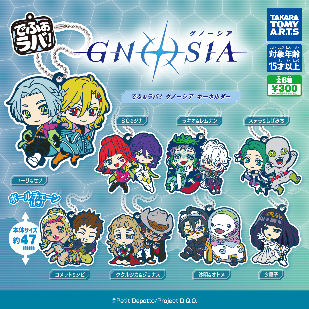 タカラトミーアーツオリジナルのデフォルメシリーズ「でふぉラバ!」のイラストを使用した、アニメ『グノーシア』のラバーキーホルダーです。交流が描かれるキャラクター同士がペアでラバーマスコットになっています。本体サイズは約5.4×4.8cm。
