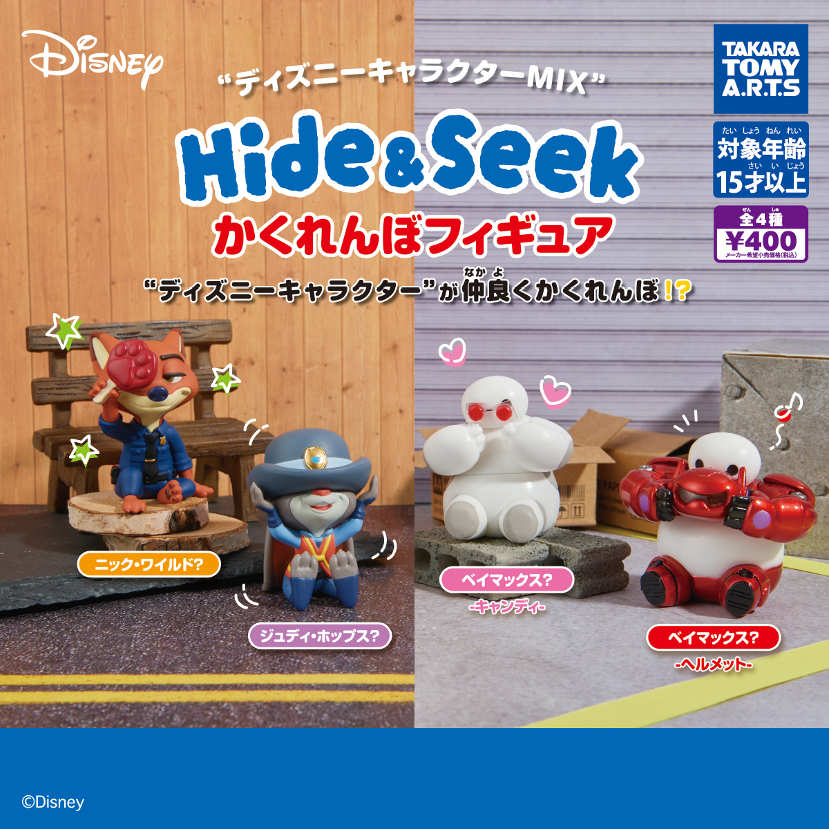 小物などで顔をかくしているタカラトミーアーツオリジナルの「Hide&Seekかくれんぼフィギュア」シリーズに、『ズートピア』と『ベイマックス』がセレクトされた「ディズニーキャラクターMIX」が登場。「ニック」と「ジュディ」は警察官の衣装、「ベイマックス」のフェイスガードはクリア成形で赤のスーツはメタリック塗装で再現されています。本体サイズは約4.8cm。