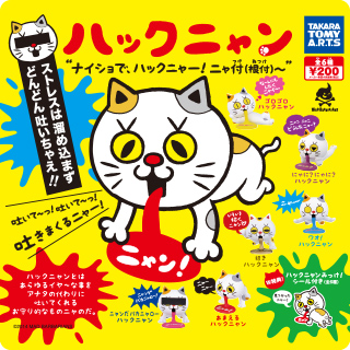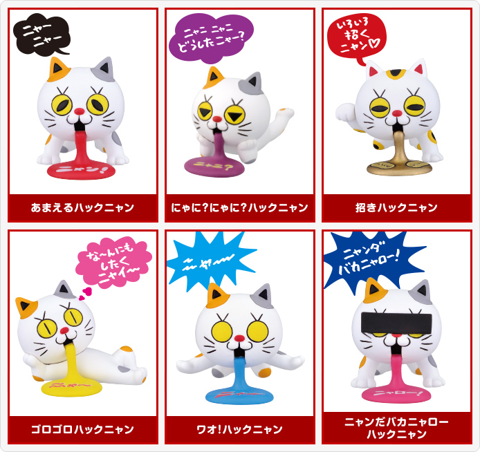 ラインナップは「あまえるハックニャン」「にゃに?にゃに?ハックニャン」「招きハックニャン」「ゴロゴロハックニャン」「ワオ!ハックニャン」「ニャンだバカニャローハックニャン」の全6種。