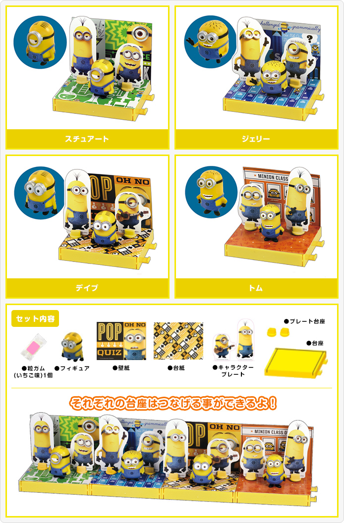 フィギュアを飾ることのできる専用の台座も同梱されており、ミニオンの楽しい世界が再現できる仕様となっています。それぞれの台座はつなげることもできるので、集めてつなげれば、遊びとコレクション性が広がります!