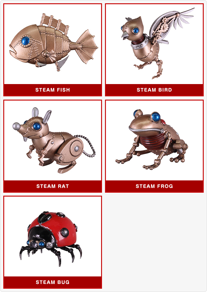 ラインナップは「STEAM FISH」「STEAM BIRD」「STEAM RAT」「STEAM FROG」「STEAM BUG」の全5種。