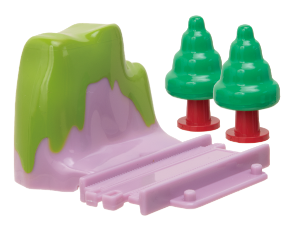 「宝箱貨車+直線レール」「恐竜の化石貨車+直線レール」「山付レール+木×2」「曲線レールセット」の全12種。