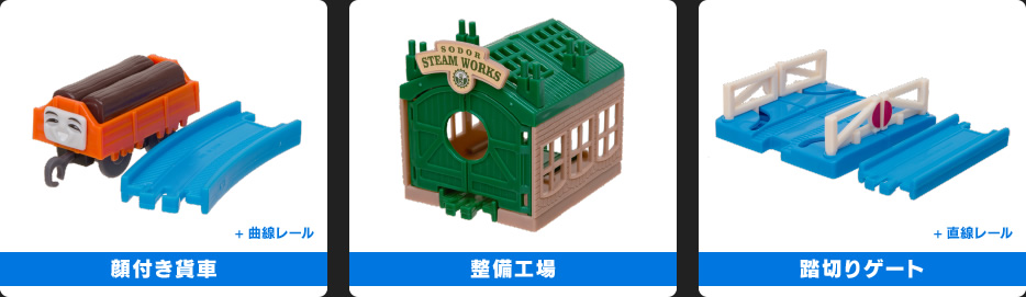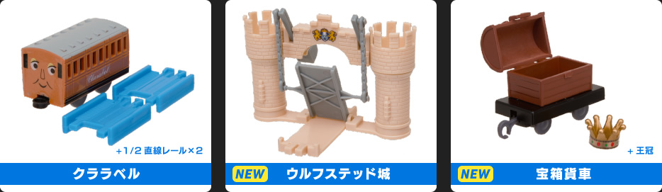 「ウルフステッド城」「宝箱貨車+王冠」「顔付き貨車+曲線レール」「整備工場」「踏切りゲート+直線レール」「鉄橋」の全16種。