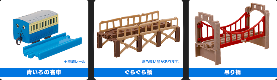 「マイティマック(ゼンマイ)」「赤いろの客車+直線レール」「黄いろの客車+曲線レール」「青いろの客車+直線レール」「ぐらぐら橋」「吊り橋」