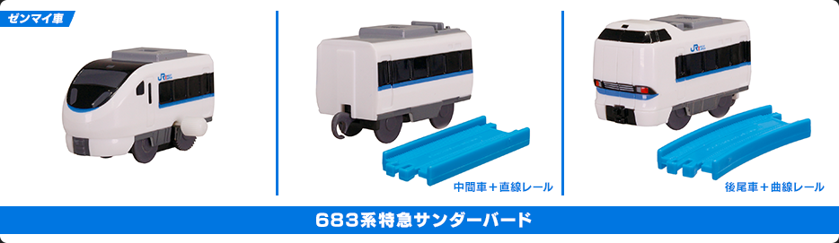 「683系特急サンダーバード ゼンマイ車」「683系特急サンダーバード 中間車+直線レール」「683系特急サンダーバード 後尾車+曲線レール」