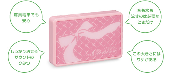 「音姫」は、トイレのときの音を自然な流水音で消してくれる、女の子なら誰もがお世話になっている、とっても便利なアイテム。本家TOTOのサウンドはそのままに、どこでも使える小さなサイズにしたのが「ケータイ音姫」です。小さいけれど機能は本物。エチケットしながら、節水、CO2削減、そして家計も助けちゃう優れものなのです!