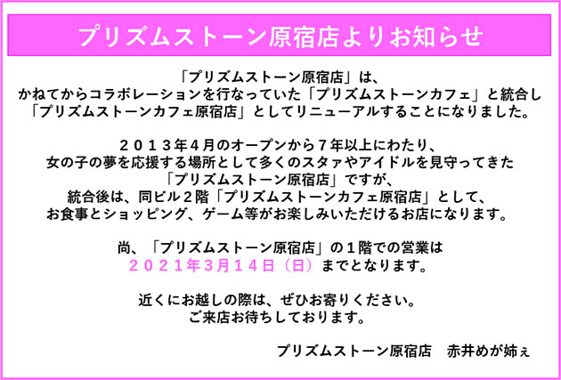 プリズムストーン原宿店よりお知らせ
