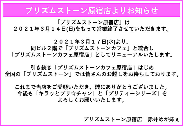 プリズムストーン原宿店統合のお知らせ